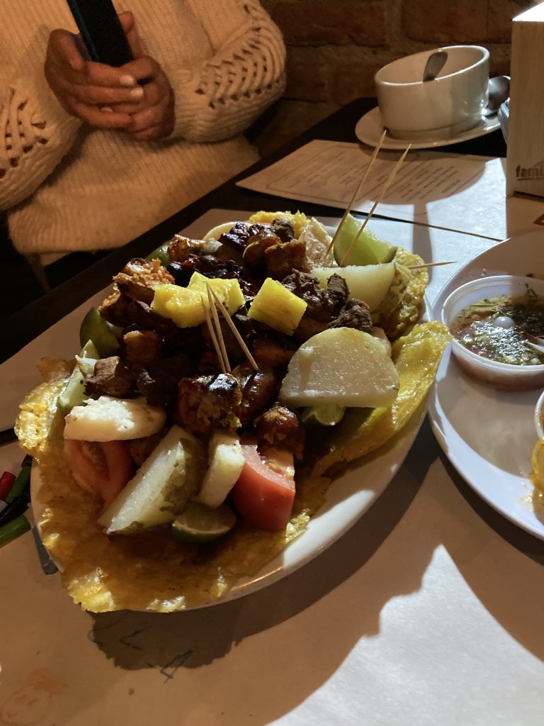 b) Abendessen bei km18 in Richtung Buenaventura: Patacones mit Huhn im Restaurant im Nebel, Merengones; 1. Übernachtung bei Borrero Ayerbe